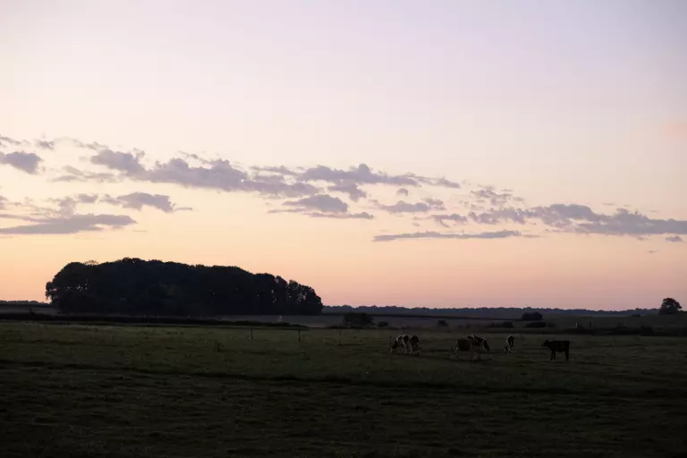 Kleines Haus erwartet Sie auf dem Land, umgeben von friedlichen Kühen.