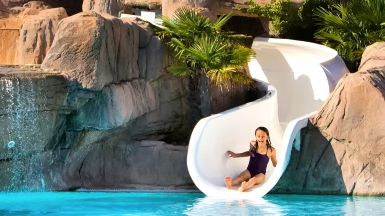 Genießen Sie die sonnigen Tage am 400 m² großen beheizten Wasserbereich mit tropischer Atmosphäre, der von April bis September geöffnet ist. Der großzügige Außenpool, das Planschbecken und die zwei aufregenden Wasserrutschen sorgen für Badespaß für die ganze Familie. Umgeben von üppiger Vegetation und reichlich Sonnenlicht bietet dieser Poolbereich eine malerische Kulisse, die zum Entspannen und Genießen einlädt.