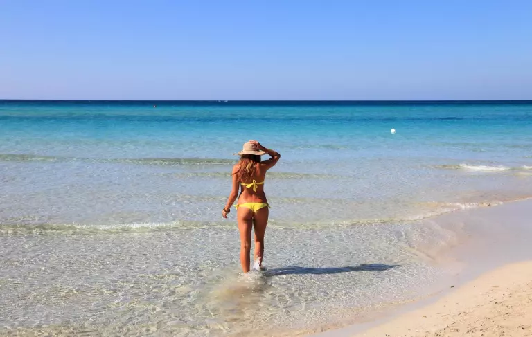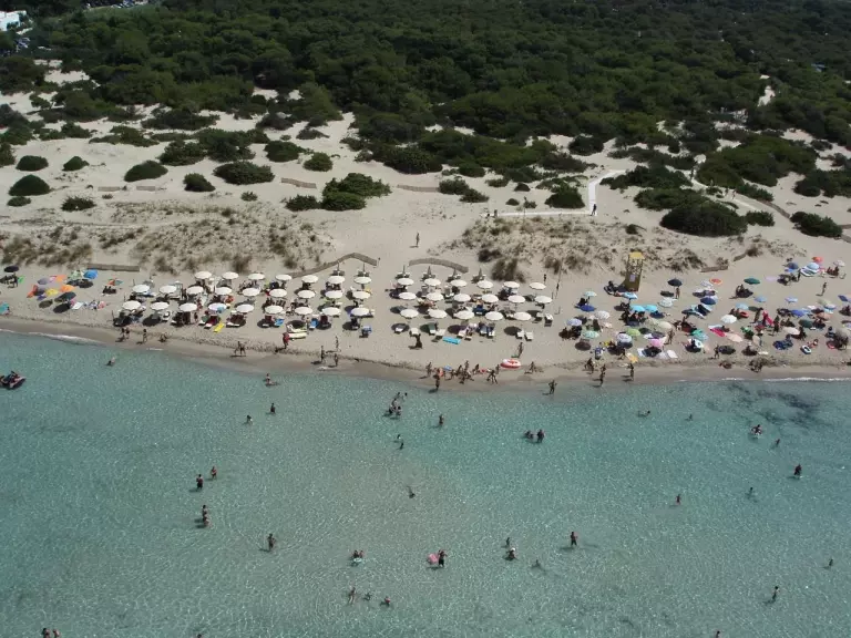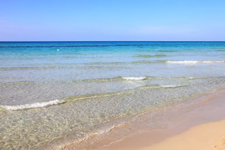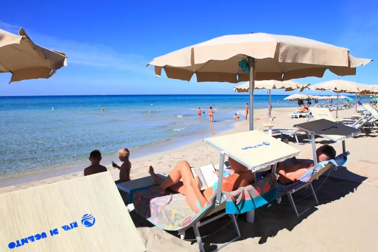 Der feine, weiße Sandstrand zieht sich kilometerweit entlang einer der eindrucksvollsten Küstenabschnitte des Salento und fällt sanft ins kristallklare Meer ab – ideal für Familien mit Kindern und für alle, die lange Spaziergänge am Ufer lieben.