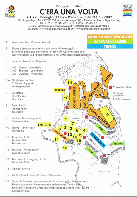 Lageplan anzeigenCITR 009068-VIT-0001 Unsere Geschichte Vor ungefähr 50 Jahren waren die Hügel von Ligurien mit Steinen, blühenden Pflanzen und mediterranen Büschen bedeckt. Die Gründer des Feriendorfes C'era una Volta, Diomedi Pierfranco und Giovanni Fiori haben diese Ecke Paradies, die nur 6 Km. von Alassio entfernt ist, so original wie möglich für seine Gäste erhalten wollen.Es gibt Plaetze fuer Caravan und Zelte, bungalow mobilhomes. im Sommer 4 Schwimmbadern, Animation, baby club.